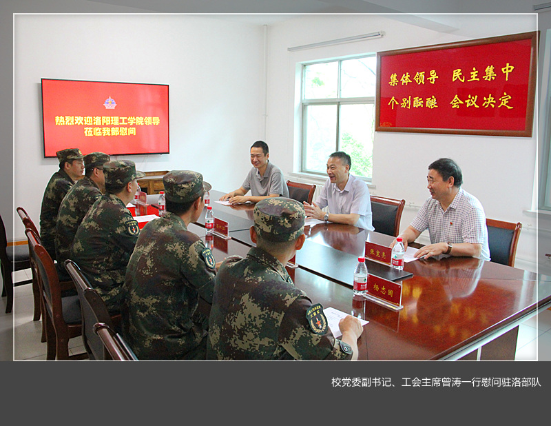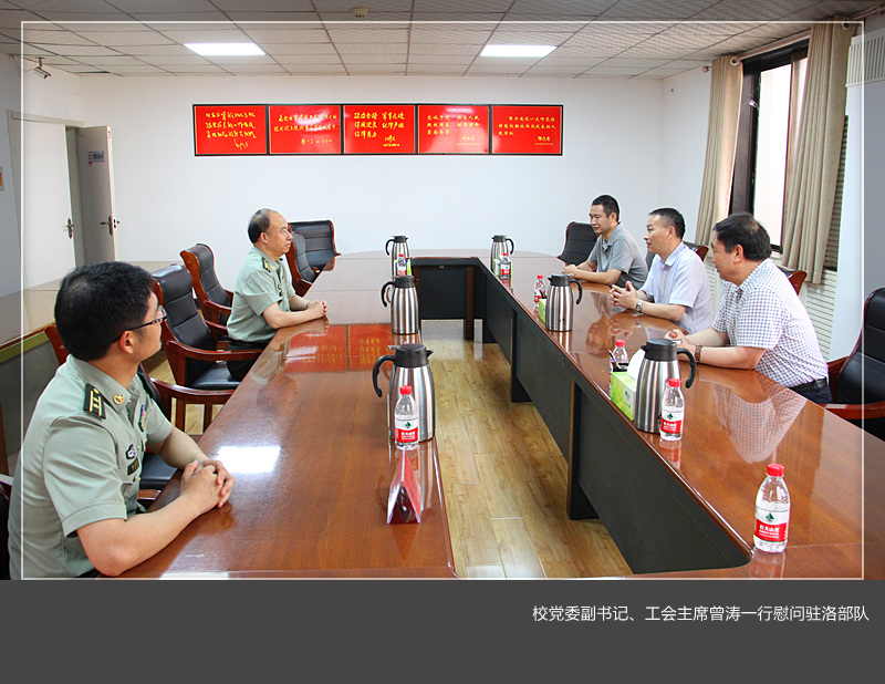 在中国人民解放军建军93周年来临之际,为进一步扎实做好“八一”期间拥军优属工作,进一步密切军政军民关系, 7月29日,校党委副书记、工会主席曾涛带领武装部负责人一行分赴洛阳市军分区、驻洛某部、洛龙区人武部等与美高梅娱乐场 建立军校共建的四个单位代表美高梅娱乐场 党委进行慰问走访、座谈交流,同洛阳市军分区政委李杏等领导和驻洛某部官兵进行座谈。