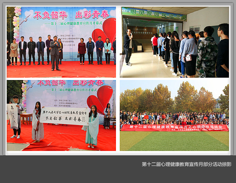 第十二届心理健康教育宣传月历时一个月,先后举行了启动仪式,新生心理普测,正能量•21天习惯养成,心理情景剧比赛,“心灵之约”专家讲座,“心灵天使”系列培训,又是一年开学季,心灵家园欢迎你——2018级新生参观大学生心理健康教育中心;“奔跑吧,青春!”——心理趣味运动会;走进“心”世界——现场咨询和测量活动;“心影随行”——影片赏析与交流等活动。通过开展丰富多彩的心理健康教育活动,更好地营造美高梅娱乐场
