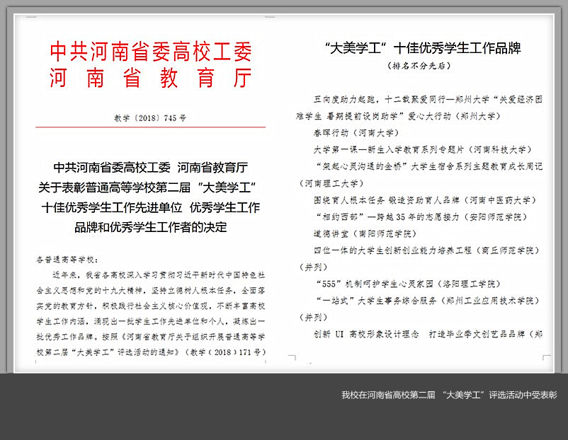 继2017年《 “六个三”精准资助育人工作模式》荣获河南省第一届十佳“大美学工”优秀学生工作品牌品牌后再次获此殊荣。