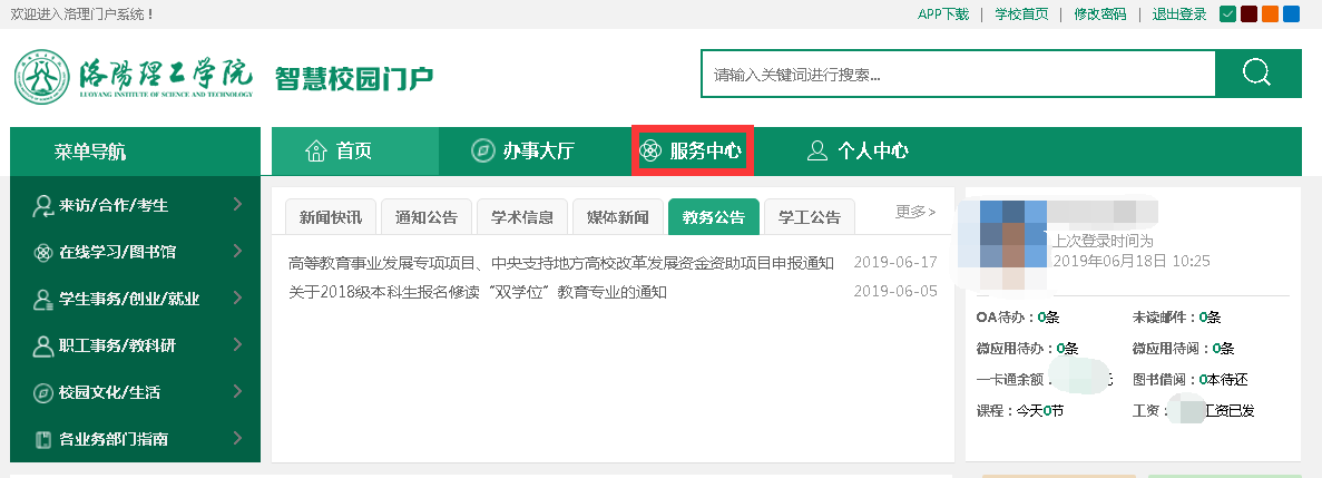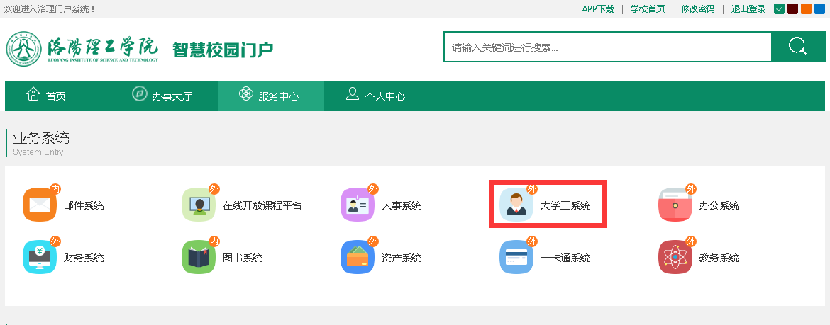 主页右上角的“新版信息门户系统”-->服务中心-->大学工系统”进入。下面分别详细介绍这两种方式。