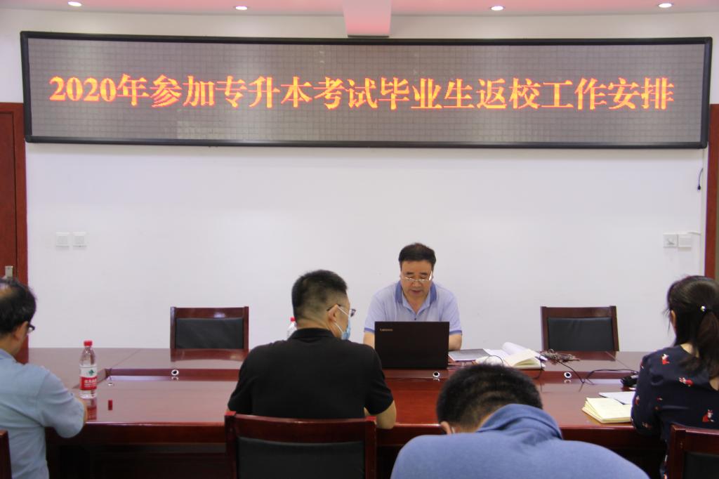 招生工作的通知》等文件进行了详细解读说明,对2020年参加专升本考试学生返校工作作出总体安排。他提出:一是全体学工人员要做好参加专升本考试学生信息排查和健康上报,摸准学生情况,按照上级文件要求,做好相关政策解读。二是要多措并举做好返校参加专升本考试学生的返校前、返校途中和返校后的疫情防护。三是要再接再厉,发扬前期毕业生返校复学中的不怕苦、不怕累的作风,全力保障毕业生顺利备考。