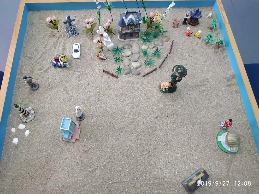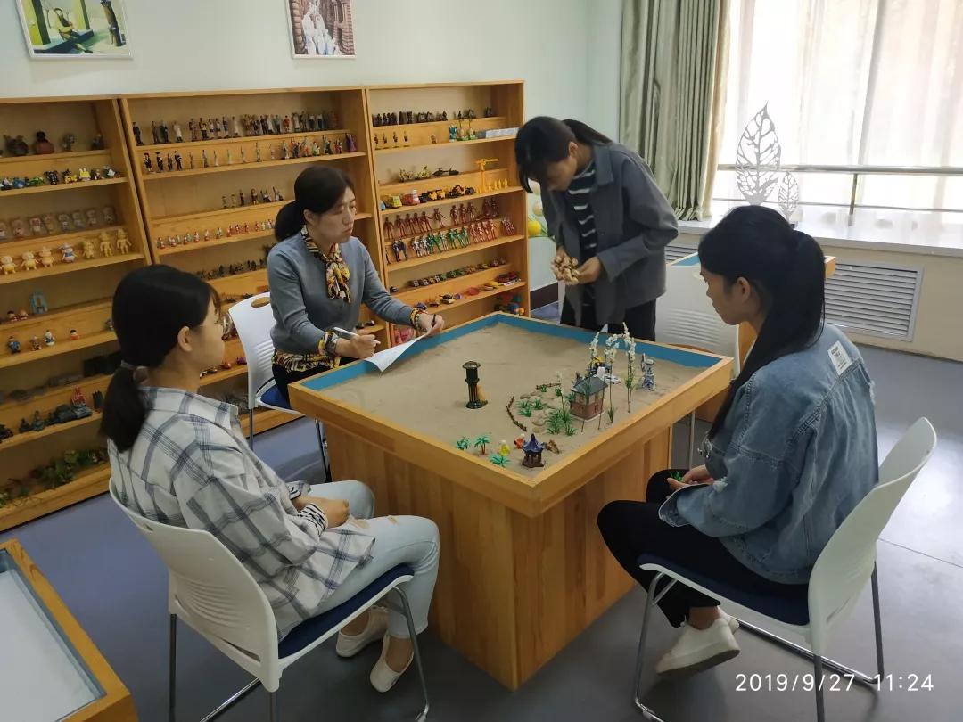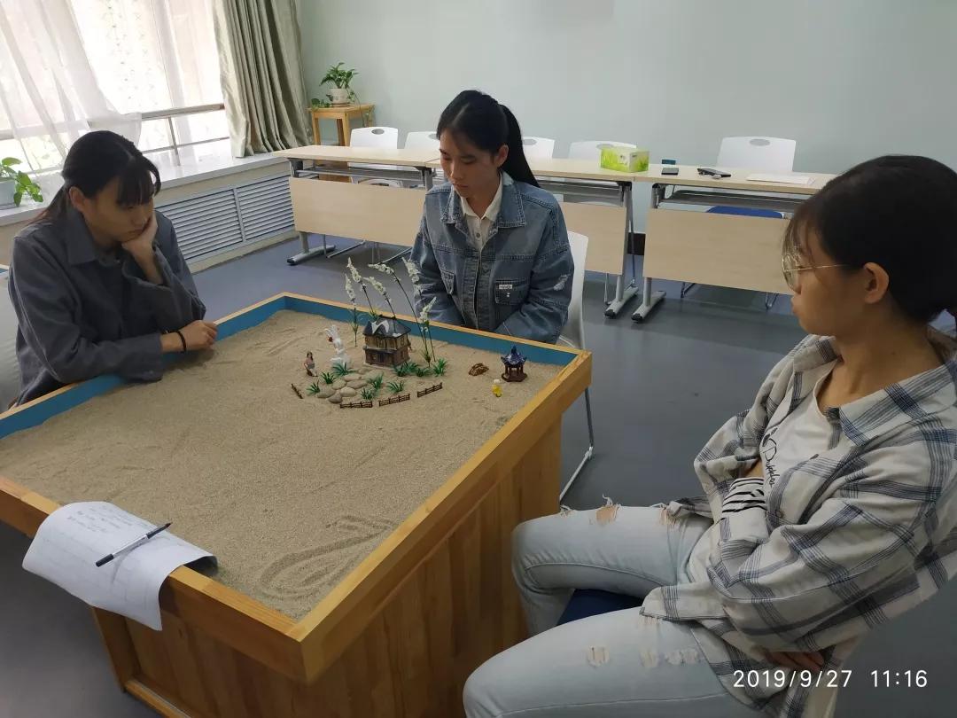 为了让同学们更深入地了解咨询的流程,黄老师安排实习生进行预约接待和来访者信息收集工作,同学们热情周到的服务以及认真的工作态度赢得了来访学生的信任,这也为她们进一步了解心理咨询的内涵打下了良好的基础。在第二小组王城校区的实习接近尾声时,黄老师组织她们进行了沙盘游戏体验活动,同学们充满热情,和小伙伴的配合度也很高,最后她们为小组成员共同完成的作品命名为“海滨小镇”。
