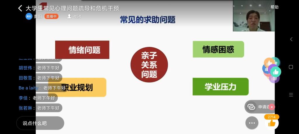 2020年“5·25心理健康教育宣传月”之“心灵天使”线上专题辅导活动,主题为《疫情期间大学生常见心理问题的疏导和危机预防与干预》,由大学生心理健康教育中心办公室主任黄阳老师担任主讲。大学生心理健康教育中心全体教师、部分美高梅娱乐场