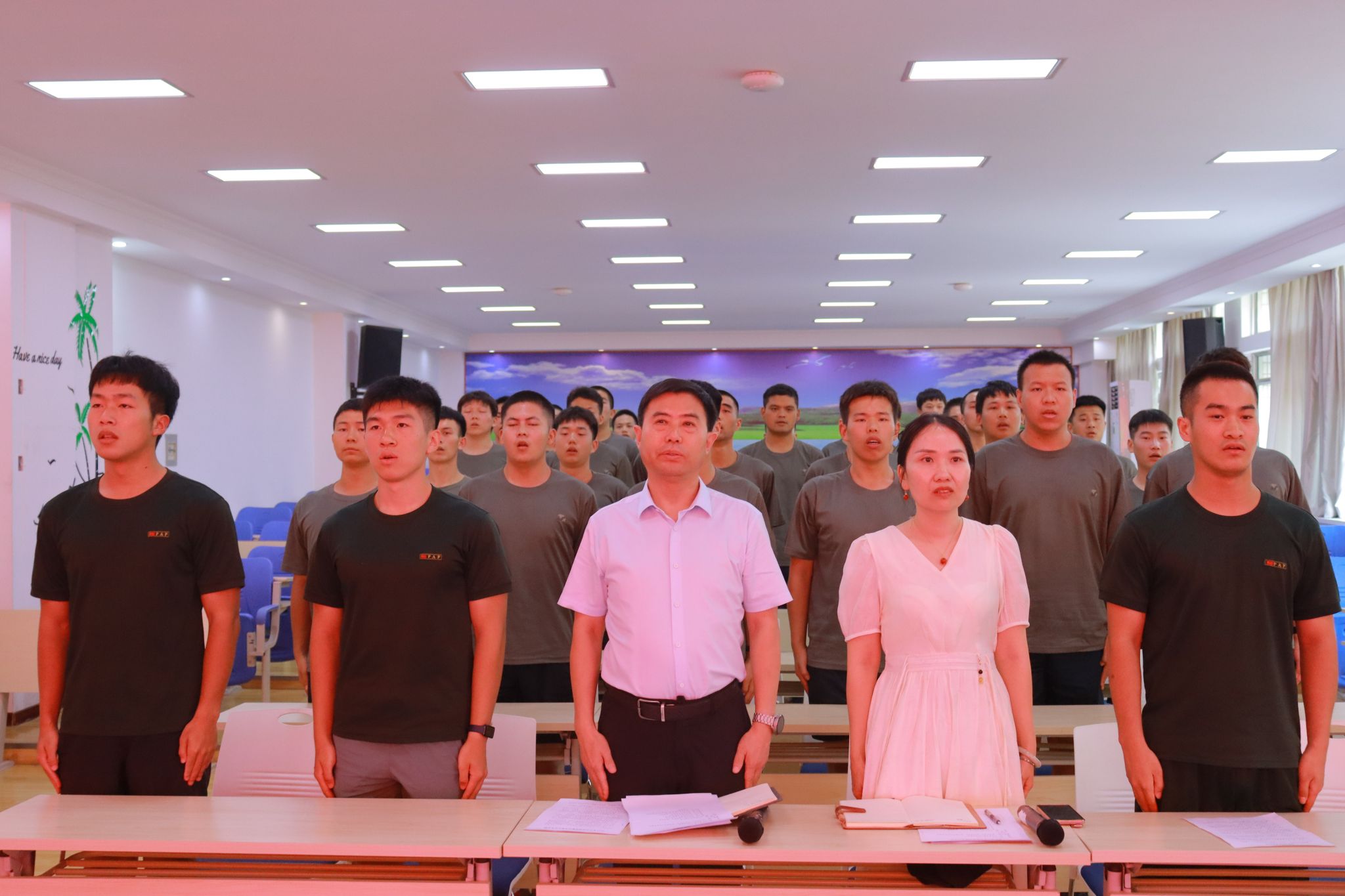 主持人宣读了集训人员名单,石老师宣读了2024年秋季应征入伍学生校园集训工作方案,教官代表全体教官宣读决心书。