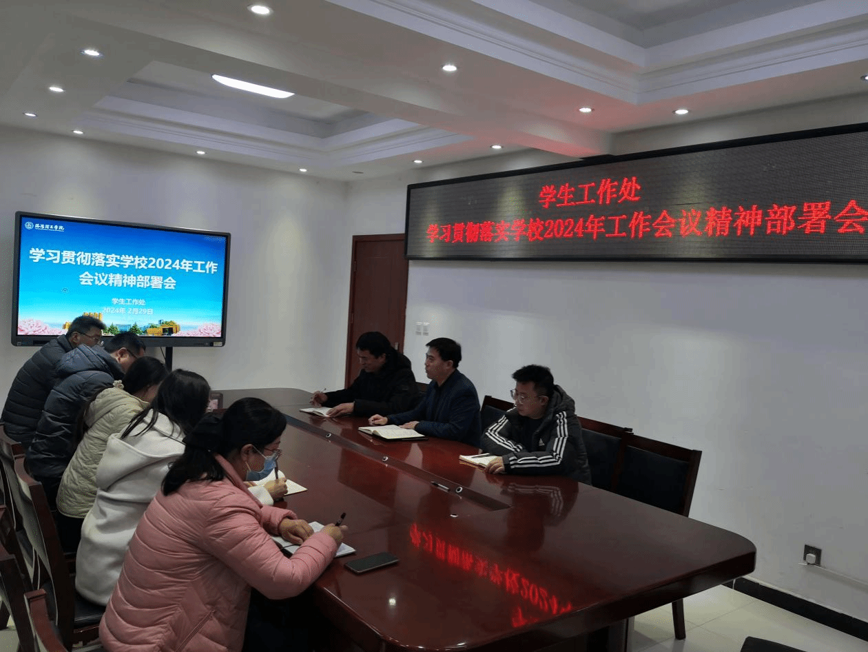 2024工作会议精神部署会在大学生服务中心106会议室举行,学生工作处全体同志参加会议,会议由学生工作处处长张克胜主持。
