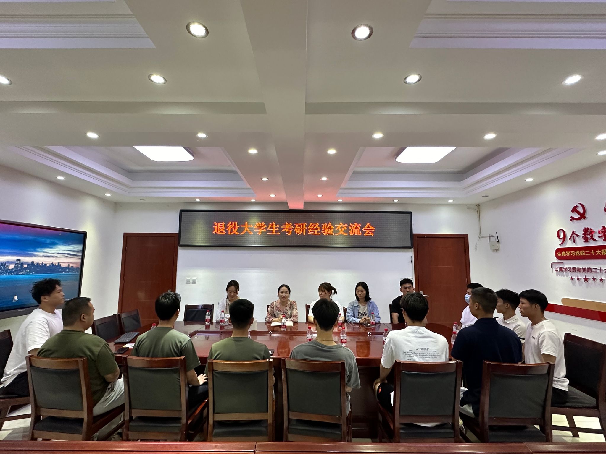 在王城校区大学生服务中心106召开退役大学生考研经验交流会,武装部老师和2024年成功考研的退役大学生以及准备参加2025年考研的退役大学生参加会议。