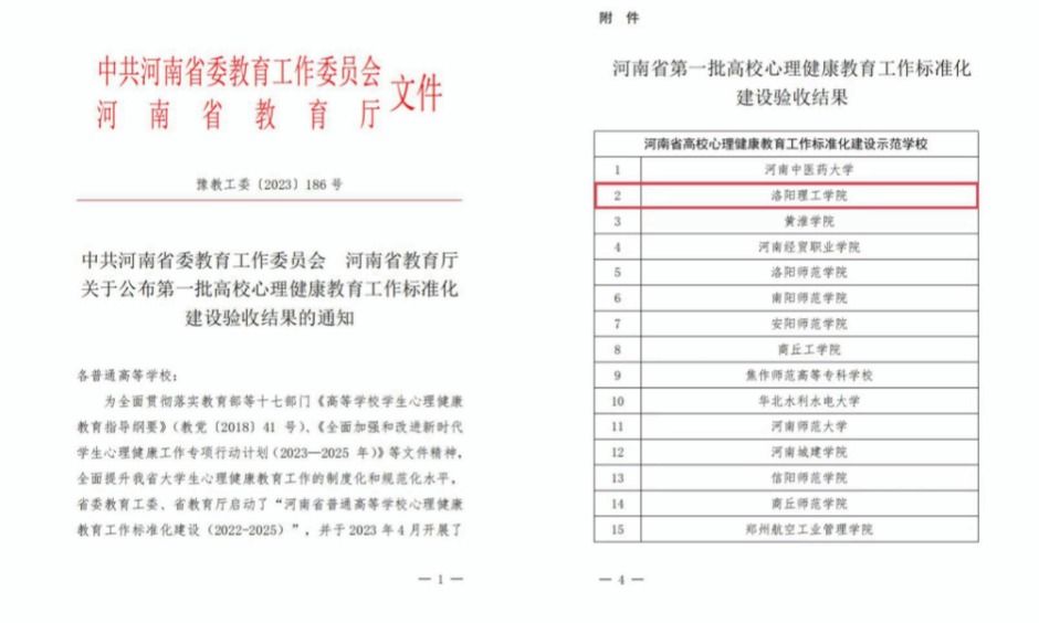 近日,河南省委教育工委、河南省教育厅发布了《关于公布第一批高校心理健康教育工作标准化建设验收结果的通知》(豫教工委〔2023〕186号),美高梅娱乐场