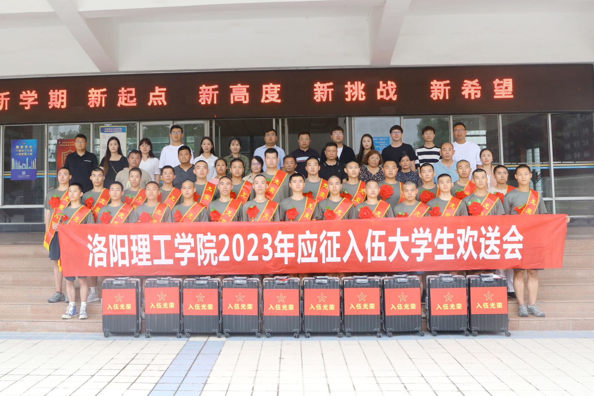 欢送会最后,武装部为入伍同学颁发纪念品,与会人员共同在公共教学楼前合影留念。