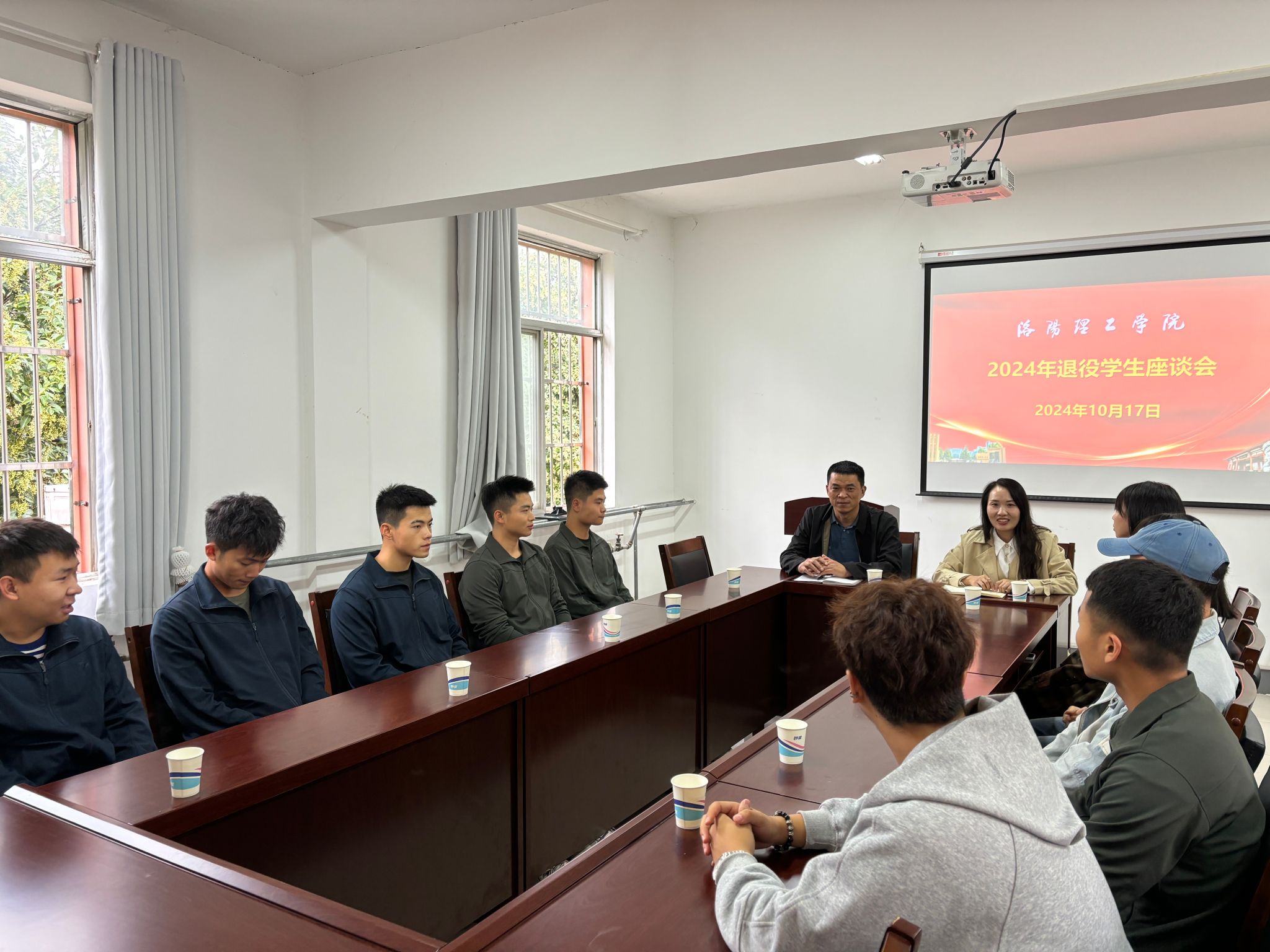 在开元校区致知社区会议室组织召开2024年秋季退役复学学生座谈会,校武装部老师,社区老师代表,在校退役学生代表和2024年秋季退役复学学生参加本次座谈会。