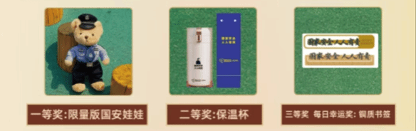 每日竞答满分100分,得分达到60分,即可参与抽取每日幸运奖;活动期间,累计得分达300分,即可获得“国家安全知识达人”电子荣誉证书并可参与一、二、三等奖的抽选;