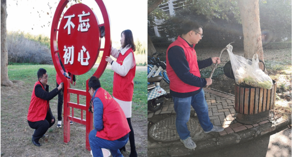 支部党员按照前期的分工,拿着垃圾桶、扫帚、簸箕、抹布、水盆等工具准时到达服务场地,大家身穿红马甲,明确目标后便迅速进入劳动状态。支部成员们齐心协力,分工合作,对每个区域进行了细致的清洁打扫。清理杂物组对整个区域进行无死角的摸排,将区域内的纸屑、塑料袋等杂物收集到垃圾桶内。牌匾亮化组对区域内的指示牌、标识牌、宣传栏进行由内而外、自下而上的清理,多次擦拭,一尘不染。供水保障组的同志不辞辛劳的往返于清洁区域和水房,将一盆盆干净的水送到清洁地点。最后工具收集组在打扫完整个区域后清点、归还了打扫工具。志愿者们并肩劳作,热情高涨,经过两个小时的辛勤劳动,清洁区域焕然一新,党员同志们红色的身影和校园深秋的金黄组成了一副美]丽的图片。