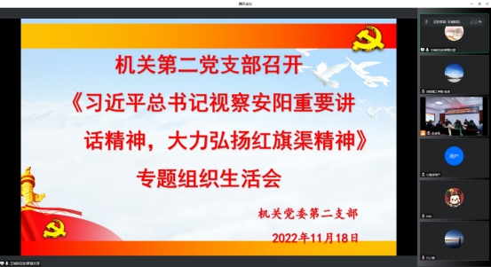 2022年11月18日下午,机关第二党支部通过线上线下相结合的方式,在大学生服务中心106会议室召开《习近平总书记视察安阳重要讲话精神,大力弘扬红旗渠精神》专题组织生活会。校党委副书记胡恩立和支部全体成员参加会议。