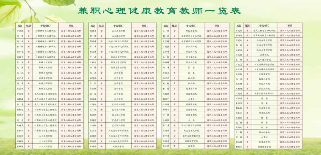 队伍健全,保障有力。大学生心理健康教育中心有专业资质的专职心理健康教育与咨询师6名,注册心理师1名,兼职心理咨询师94名,聘请精神专科医生2名,心理素质拓展训练指导教师2名,形成了以专职教师为骨干,外聘专家为补充,专兼结合、相对稳定、素质较高的心理健康教育工作队伍。此外,中心注重对学生会心理部、心理协会、心理委员等朋辈队伍的教育培训与管理,发挥学生骨干的有效作用。