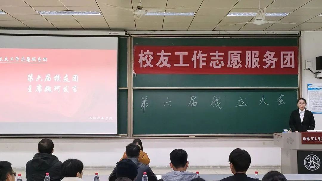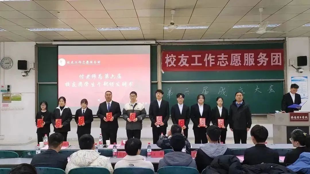 第五届校友工作志愿服务团主席张继聪做《工作报告》,苗超鹏老师宣读第六届校友团学生干部名单,付俊强老师为学生干部颁发聘书。