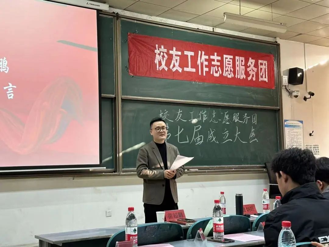 苗超鹏老师讲话。他对第七届校友工作志愿服务团的圆满成立表示祝贺,同时提出了三点要求,一是要做一个政治过硬的人,二是要做一个学习努力的人,三是要做一个工作靠谱的人。同时,他希望校友团成员珍视和把握校友服务团这个平台,施展才华,绽放青春。