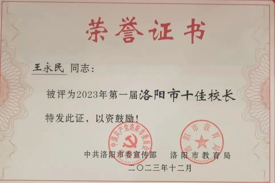 校友、洛阳市洛龙区第一实验小学教育集团党委书记、校长王永民,两位校友喜获“洛阳市首届十佳校长”荣誉称号。