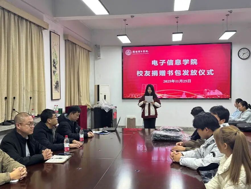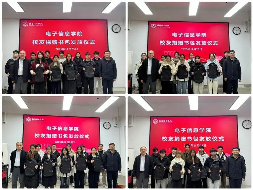 范伟虽未能亲临现场,但仍以“云端视频”的方式为学弟学妹送来寄语。视频中,他回顾了在母校的成长经历,勉励同学们珍惜荣誉、奋发向前,在学习与人生的道路上持续奔跑。随后,杨涛、陈朝辉为2024-2025学年国家奖学金、国家励志奖学金获得者发放书包。