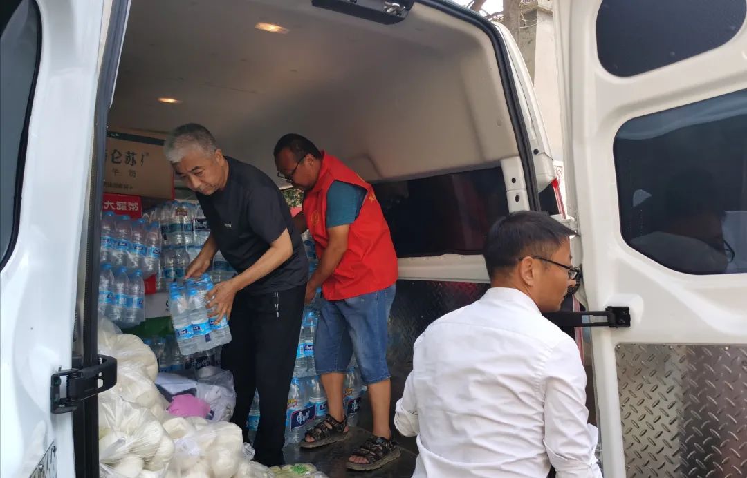 一个上午的紧急筹备,15名校友志愿者集齐6辆物资车,筹集瓶装矿泉水300多件,面包、八宝粥100多箱,衣物、被子、毛毯20多箱,驰援巩义市米河镇双楼村。