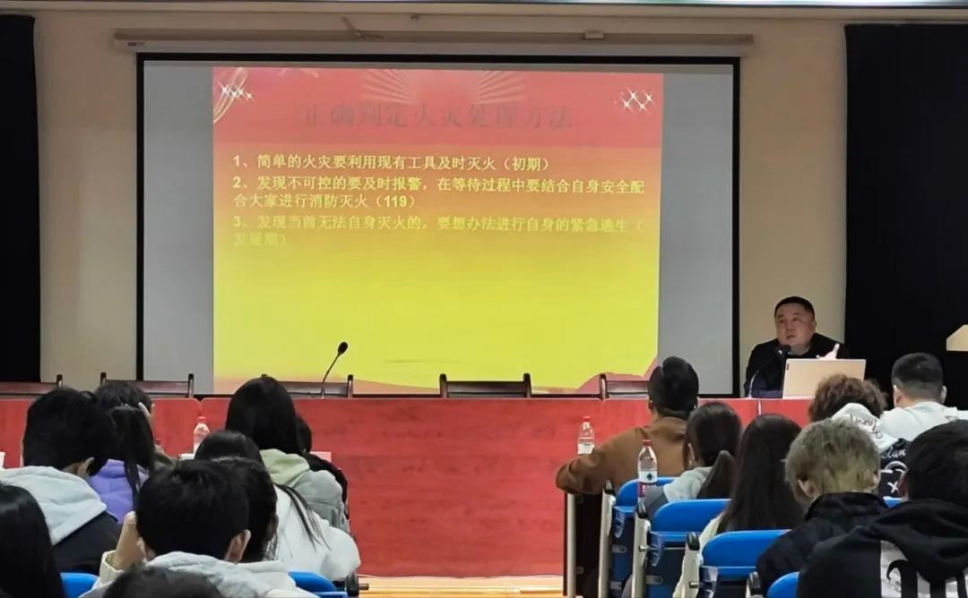 在报告中,郭坤彬向同学们介绍了火灾的燃烧三要素,举例了多起大学发生的火灾事件,传授了预防火灾的相关知识,介绍了消防器材的工作原理及使用方法,提醒大家校园防火不容忽视。同时,郭坤彬也使大家直观地感受到火灾随时可能发生在自己身边,从而提高对消防安全的重视程度。