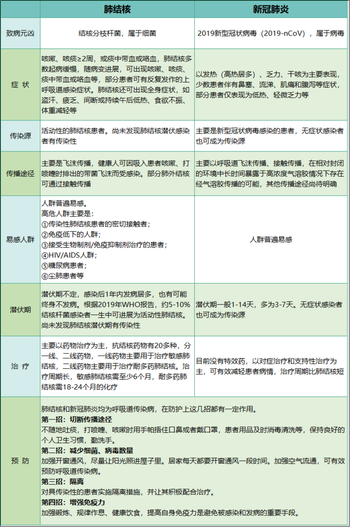 虽然肺结核和新冠肺炎症状很相似,但病原体是不一样的。新冠肺炎是由新型冠状病毒引起的,肺结核是由结核分枝杆菌引起的。对这两种疾病,完全可以通过流行病学史以及临床检查做出明确的鉴别诊断。从症状来看,肺结核引起的发热,多半是午后出现低热,早期不会出现中高度发热症状。肺结核症状中的咳嗽、咳痰会持续两周以上,也可能会有痰中带血或咳血的情况,出现以上的症状,一定要去结核病的专科医院及时就诊。其他区别请见下图。