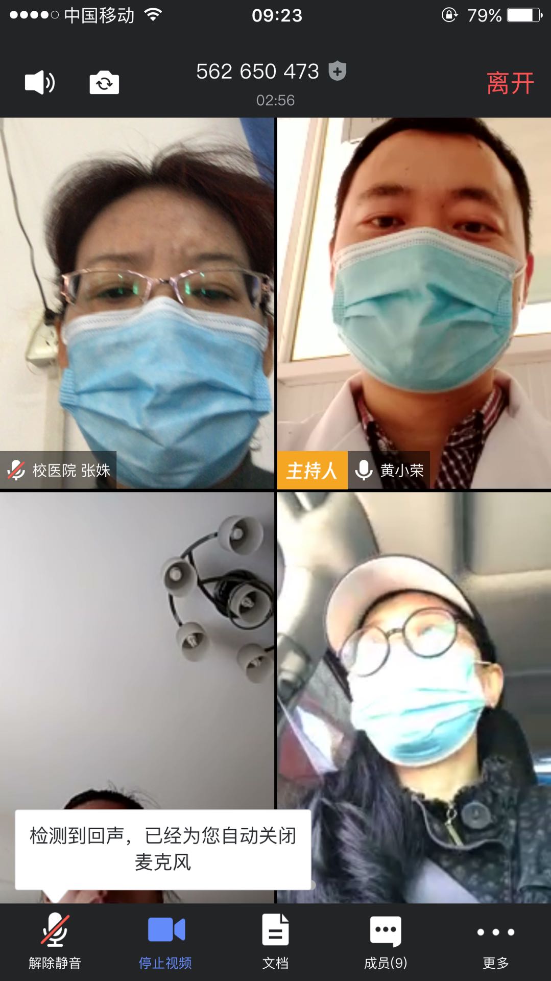2020年4月28日,校医院召开视频会议,校医院院长赵喜花传达了美高梅娱乐场 新冠肺炎防控工作领导小组最新的工作精神,具体安排了美高梅娱乐场 隔离观察区物资和人员配备、复学前的演练和复学后的校医院工作安排,校医院书记张姝从政治高度再次强调了每一位医务工作者都是这场疫情“战役”的主角,每一位职工均要扮演好自己的角色,冲锋在前,发挥白衣天使的作用。同志们畅所欲言,院长赵喜花认真听取了职工们的意见和建议,及时解答了职工们工作中的疑惑,肯定了同志们的工作积极性和主人翁精神。