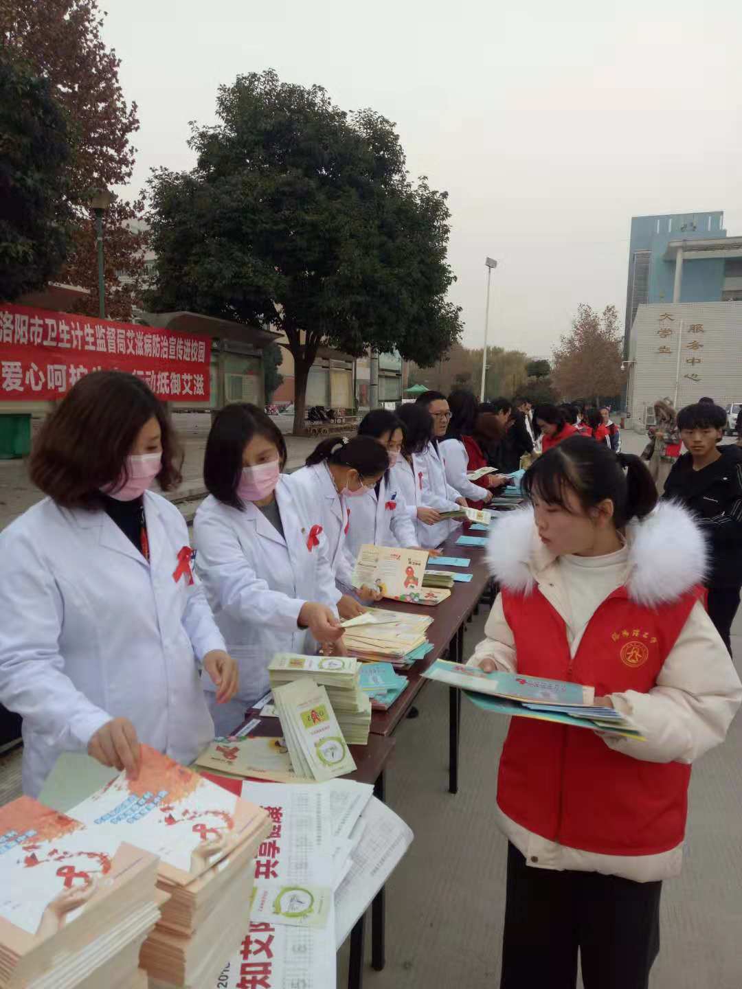 2018年11月30日下午,洛阳市卫生监督局和美高梅娱乐场 校医院在镜月广场开展了“世界艾滋病日”知识宣传。洛阳市卫生监督局的领导为同学们普及了相关法律知识。校医院为现场的“青年志愿者”们讲解了防控艾滋病的相关知识。大夫们和“青年志愿者”为校园里的同学们发放了艾滋病宣传单页和“防艾礼包”。“青年志愿者”作为防艾宣传的小火种,将在寒冷的冬日为洛理同学们点燃健康守护的希望之火。