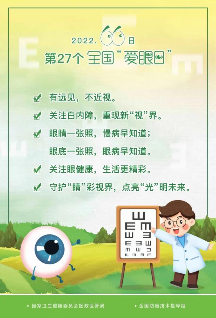 2022年6月6日是第27个全国“爱眼日”,主题是“关注普遍眼健康,共筑‘睛’彩大健康”。