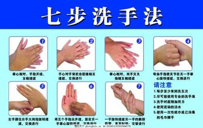 三、七步洗手口诀顺口溜:“掌心对掌心;手心压手背;十指交叉摩;手握关节搓;拇指围轴转;指尖掌心揉;手腕别放过。”