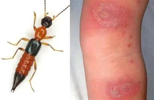 有诊断价值的是灼痛和痒。隐翅虫的毒素有3种,即毒隐翅虫素、拟毒隐翅虫素和毒隐翅虫酮。在隐翅虫的卵、幼虫、蛹和除翅以外的成虫各部,都有毒素存在。据有关文献报道,全世界能引起皮炎的隐翅虫有538种30亚种,我国境内已知隐翅虫(属)有72种2亚种。