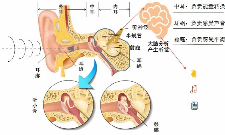耳朵是人体的听觉器官,它由外耳、中耳和内耳三部分组成。外耳:外耳由耳廓和外耳道组成。耳廓主要起着收集声音的作用。外耳道连接耳廓和中耳。中耳:位于外耳和内耳之间,由鼓室、咽鼓管、鼓窦和乳突四部分构成。中耳主要起着传导和扩大声音的作用。内耳:结构非常复杂,由前庭、半规管和耳蜗三部分组成。前两部分负责平衡感觉,而后者与听觉有关。