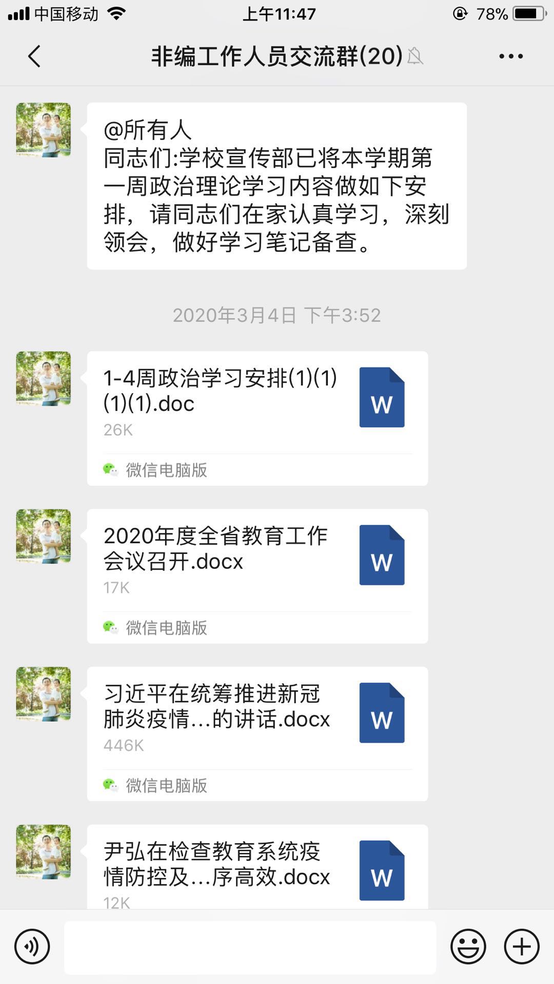 由于新冠肺炎的影响,校医院为了保障职工身体健康、人身安全,同时圆满完成美高梅娱乐场 党委宣传部发布的“2019/2020学年第二学期1-4周政治学习安排”,遂采取了微信通知、职工自学的方式进行。学习内容:1.学习贯彻落实习近平总书记关于新冠肺炎疫情防控系列讲话精神;2.学习贯彻落实省长尹弘在检查教育系统疫情防控及开学前准备工作时提出的各项要求,学习贯彻落实2020年度全省教育工作会议精神。