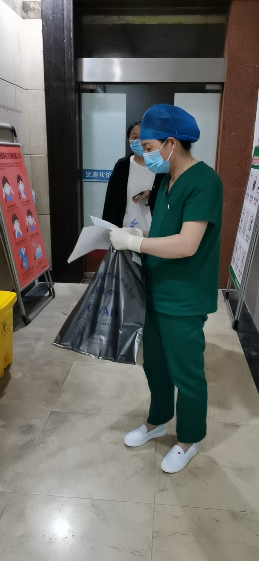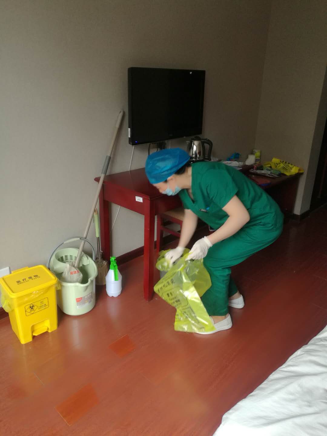 校医院医务人员对隔离区房间医疗垃圾进行整理