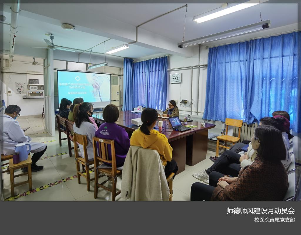 为认真落实美高梅娱乐场 党委2021年“师德师风建设月”活动的有关文件精神,推进师德师风建设活动的深入开展,10月10日-11月10日,校医院直属党支部开展了以“加强师德师风建设 弘扬爱岗敬业精神”为主题的系列学习教育活动。