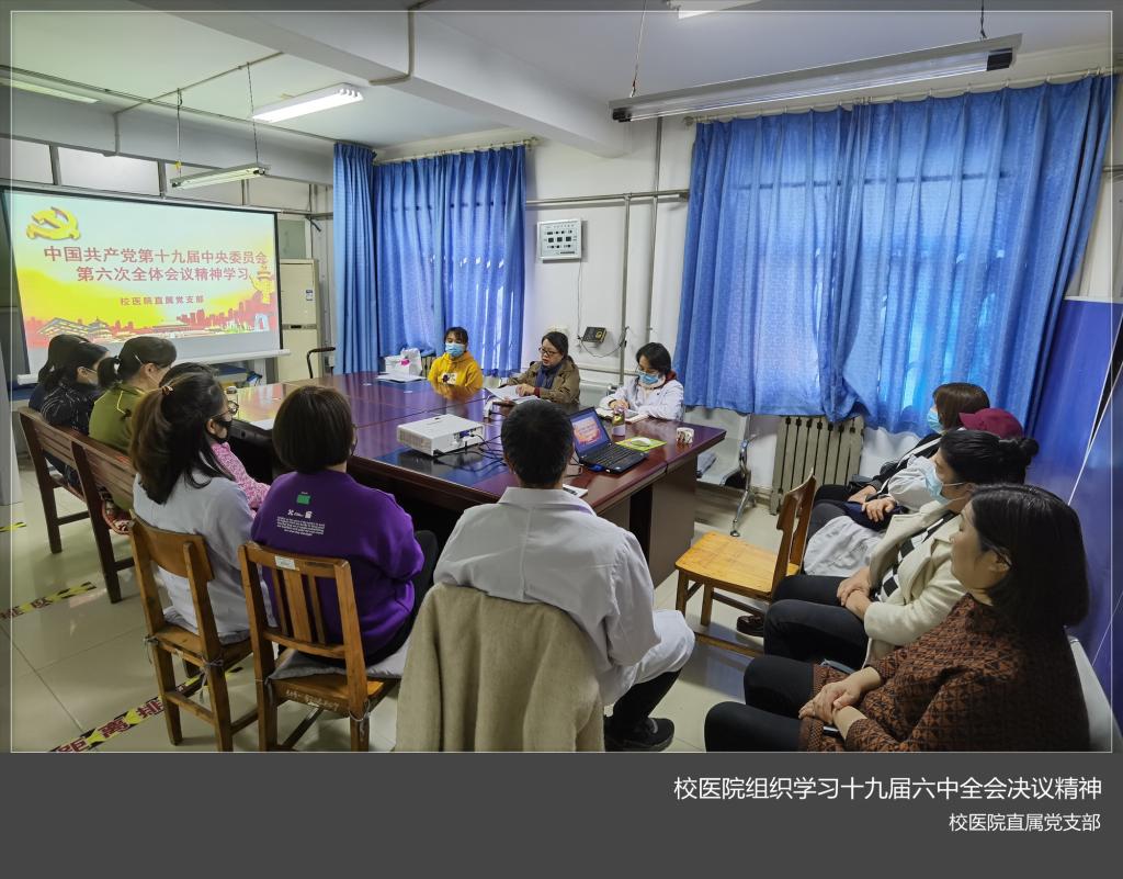 11月18日下午,校医院直属党支部组织校医院全体教职工,深入学习党的十九届六中全会《中共中央关于党的百年奋斗重大成就和历史经验的决议》和关于《决议》的说明。