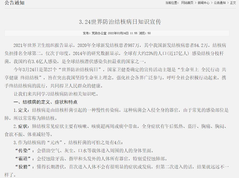 2022年3月24日是第27个世界防治结核病日,国家卫健委确定的宣传活动主题是“生命至上、全民行动、共享健康、终结结核”,旨在突出我国坚持生命至上理念,强化社会各界广泛参与,呼吁全社会积极行动起来,携手终结结核病的流行,共同捍卫人民群众的健康。