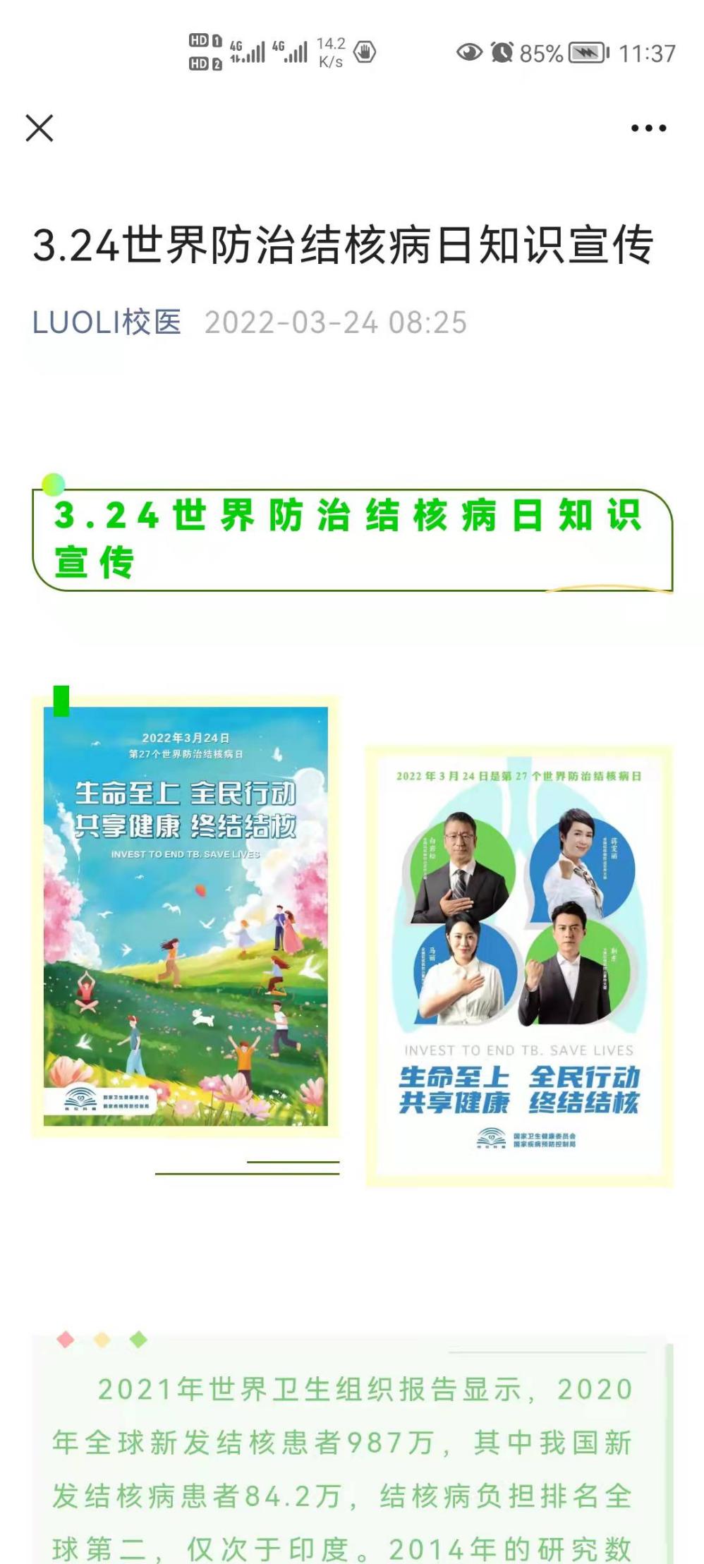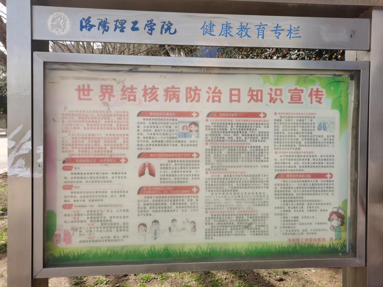 为做好美高梅娱乐场 今年的“世界防治结核病日”宣传活动,提高美高梅娱乐场 师生结核病防控能力,消除结核病危害,校医院在校园积极开展形式多样的防治结核病宣传活动,形成了良好防治氛围。