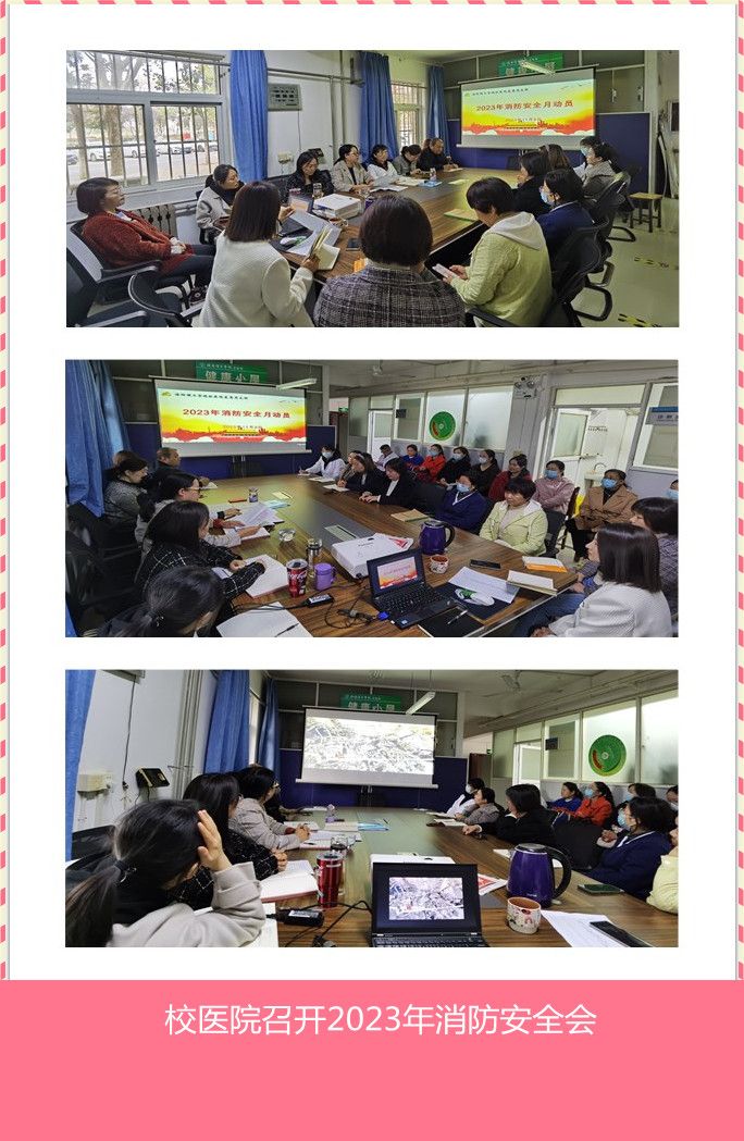 2023年119消防宣传月活动的通知》要求,2023年11月9日,校医院直属党支部召开校医院全体职工安全工作会议,学习消防安全知识,观看关于医疗机构消防安全事故案例视频,对校医院消防安全进行全面分析排查,进一步明确校医院各区消防安全责任人和工作职责。