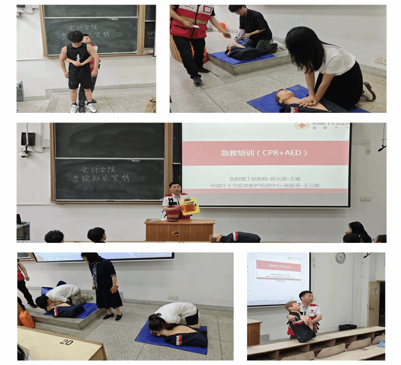本次活动校医院特邀洛阳市红十会专家杨振亚老师和王元峰老师为师生授课。此次培训采用理论讲解与实际操作相结合的方式,内容涵盖了常见急症的识别与处理、心肺复苏术、海姆立克急救法、AED(自动体外除颤仪)的使用等重要知识点。在培训中,学生们积极参与模拟演练、亲身体验,急救专家现场进行详细的指导和纠正,确保学生们的操作正确规范、更加深入地了解了急救的操作要点和注意事项。