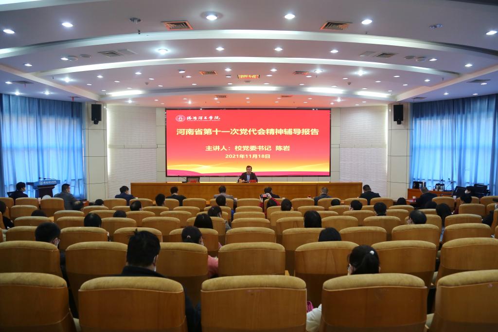 11月18日,校党委书记陈岩教授以《贯彻省第十一次党代会精神,在二次创业的实践中推动美高梅娱乐场 事业高质量发展》为题,作学习河南省第十一次党代会精神辅导报告。机关党委第一党支部(党政办公室)全体党员、马克思主义美高梅娱乐场 全体思政课教师参加报告会。