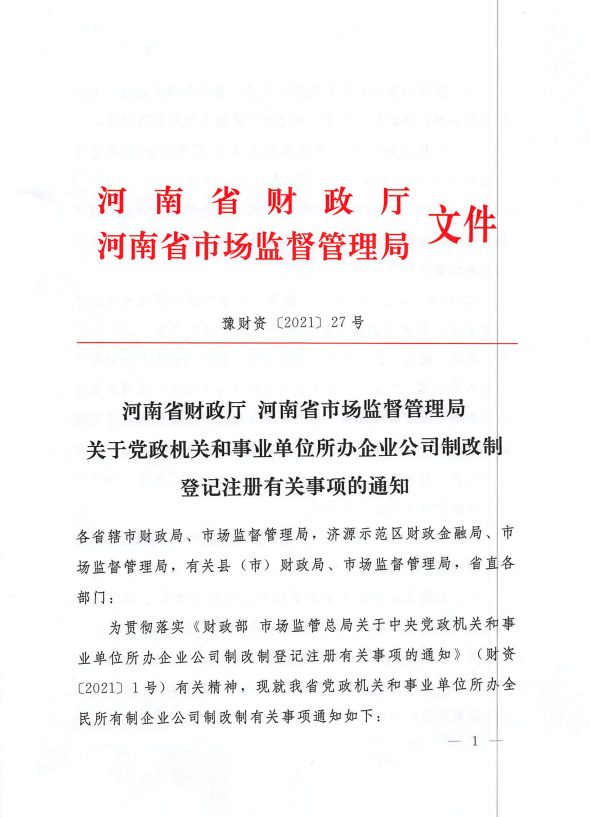 河南省财政厅 河南省市场监督管理局关于党政机关和事业单位所办企业公司制改制登记注册有关事项的通知