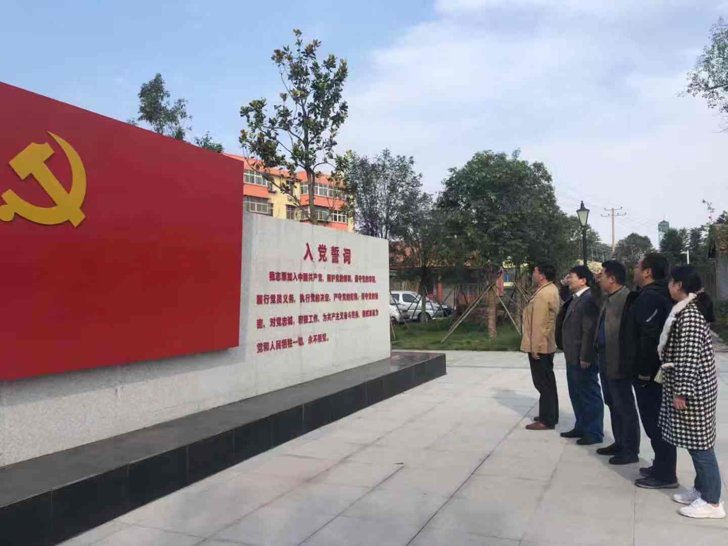 在纪念馆党建广场,面对党旗,支部党员高举右拳,重温入党誓词,进行了庄严宣誓。