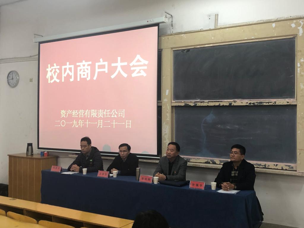 11月21日上午,公司在开元校区A1教室召开了第一次校内商户代表大会。公司党总支书记李绍辉、总经理王群芳、副总经理杨朝良等领导参加了会议,另外参会的还有经营管理科全体人员及校内47位商户代表。