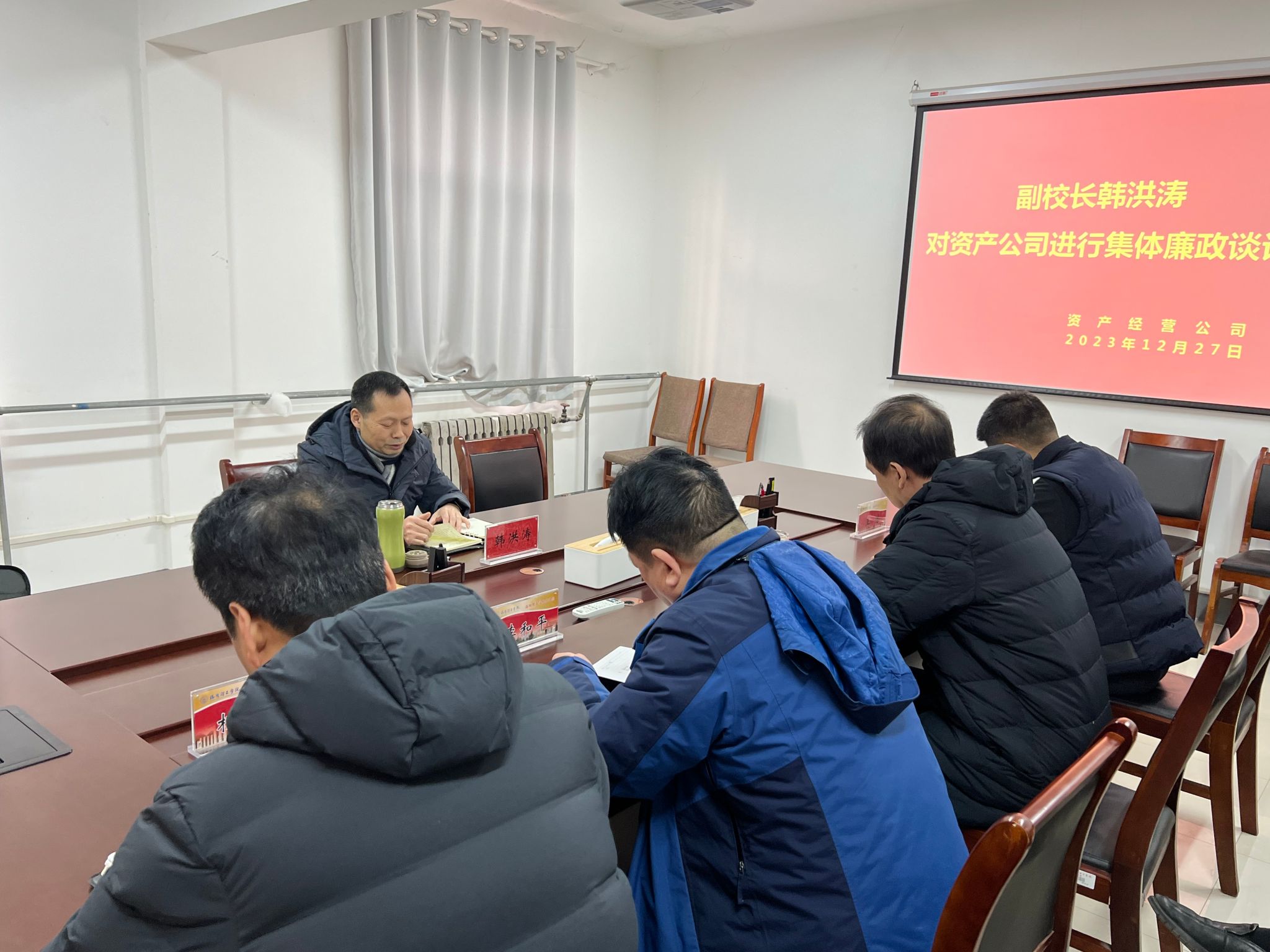 12月27日下午,副校长韩洪涛到公司进行集体廉政谈话。公司班子成员、各部门负责人参加会议。