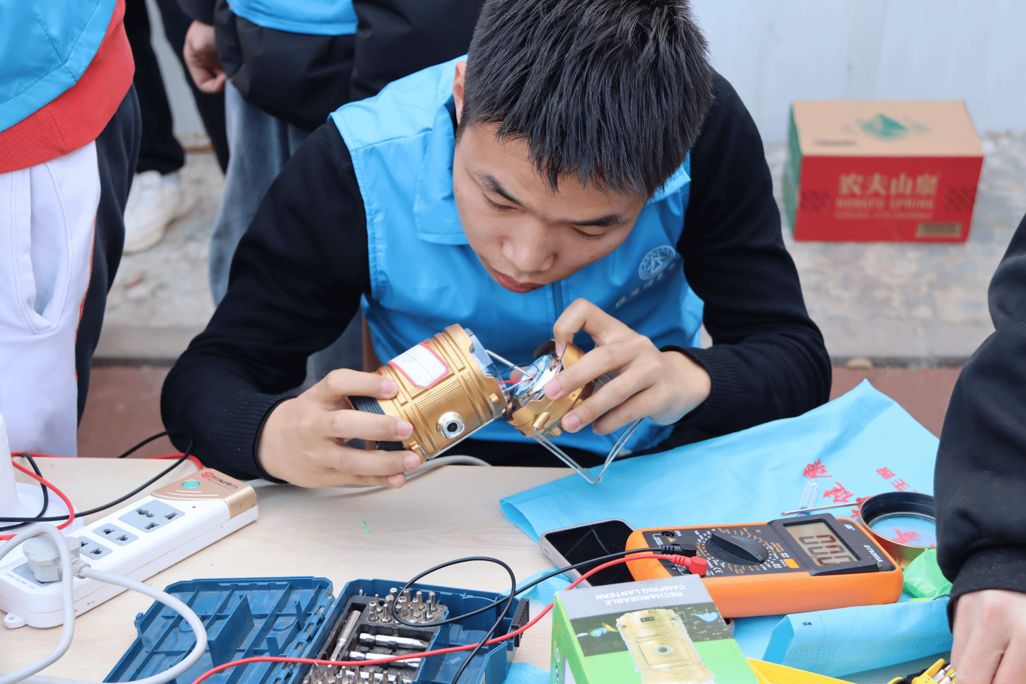 下午2点,“I科普”科技志愿服务队10多名大学生队员们早早来到龙祥社区,布置场地、宣传志愿精神,闻讯赶来的社区居民们在维修摊位处有序排起队伍,把家中带来的烧水壶、绞肉机、电饭煲、电磁炉、豆浆机、小台灯等三十余件小家电交到志愿者手中,等待志愿者们“会诊”。队员们热情地接待前来维修的社区居民,并对维修家电一一登记,仔细分析每一件家电存在的问题,通过检测、拆卸、维修、调试、安装,让各类小家电“重获新生”,居民们看着修好的小电器直夸大学生志愿者手艺好、本领强。