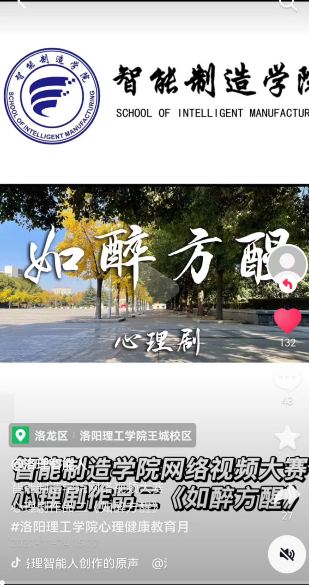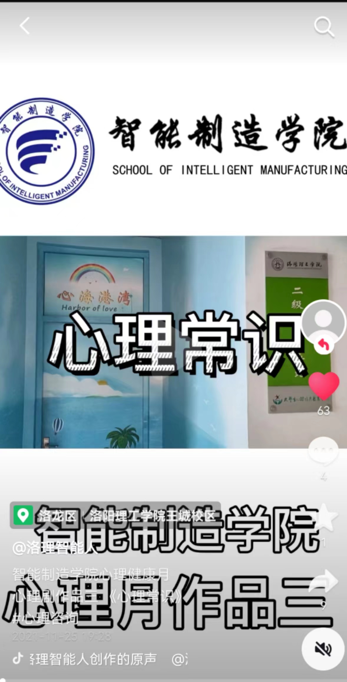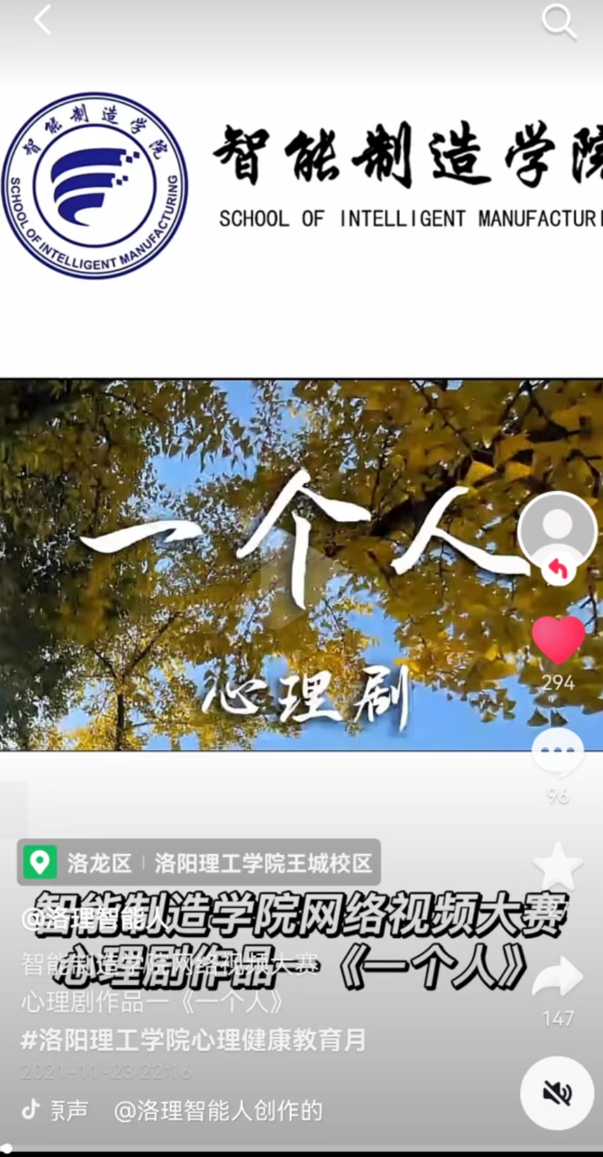 美高梅娱乐场 智能制造美高梅娱乐场 将心理情景剧运用至心理实践课程中,举办网络心理情景剧大赛,以学生宿舍为题材,讲述宿舍的“人情冷暖”。预赛通过线下招募演员的方式参加比赛。最终通过决赛评比出3部优秀心理情景剧作品《一个人——我融入了大学生活》《如醉方醒——我逃离了网络世界》《分享大学生常见心理问题和解决方法》,并发布至美高梅娱乐场 微信公众号和抖音号“洛理智能人”进行展播,其中作品《一个人》、《如醉方醒》参加美高梅娱乐场 第十五届心理健康宣传月活动之网络短视频决赛,《一个人》荣获三等奖。