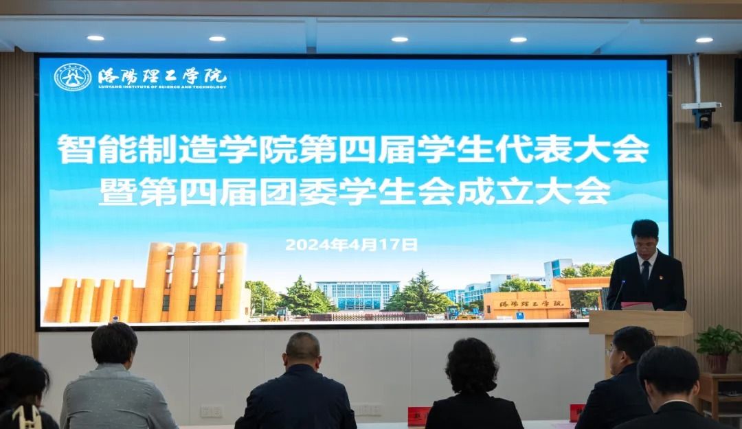 2024 年 4 月 17 日 16 时 30 分,智能制造美高梅娱乐场 第四次学生代表大会暨第四届团委学生会成立大会在 CS203 会议室隆重举行。党委书记赵建利、副院长兼党委副书记朱德荣、副处级辅导员曲振峰、团委副书记韩玮、学生代表、学生干部代表参会。本次大会由朱轶然主持。