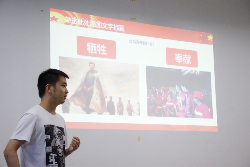 最先进行的是党史故事汇,学生党员通过研究整理革命先烈、当代英雄、身边榜样的故事,深刻领悟百年奋斗历程,学习革命先辈不畏艰险、顽强拼搏、敢于献身的精神。杨镇伟同志首先分享了王怀敬和黄文秀同志的光荣事迹:王怀敬是一位邮递员,也是他们当地邮局的唯一职工,骑着自行车每天在大山里往返送信,一送就是27年;黄文秀在大学毕业后毅然决然地选择了最贫困的大山深处,奋斗在脱贫攻坚第一线,不幸遭遇山洪壮烈牺牲。从他们的身上体现出共产党员不怕牺牲、不畏艰难的奉献精神,用美好青春诠释了共产党人的初心使命。