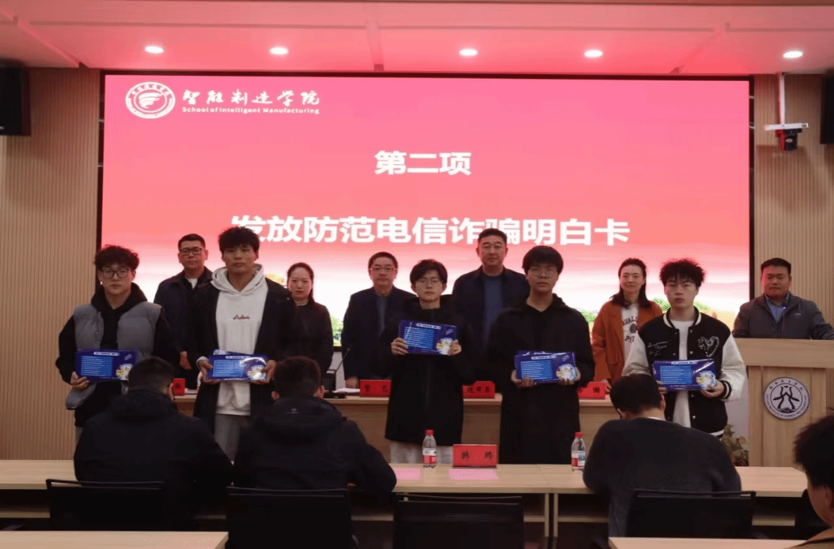 首先,保卫处领导和智能制造美高梅娱乐场 领导对各年级代表发放防范电信诈骗明白卡,提出每个宿舍张贴一份,时时刻刻提高防范意识。