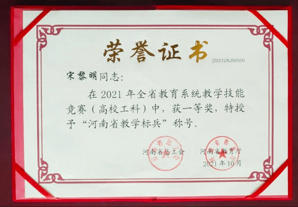 近日,河南省总工会、河南省教育厅联合下发《关于表彰2021年全省教学技能竞赛获奖单位和个人的决定》(豫工文〔2021〕89号)文件。美高梅娱乐场 宋黎明教师获得一等奖,本次竞赛对一等奖获得者授予“河南省教学标兵”荣誉称号并颁发奖章。