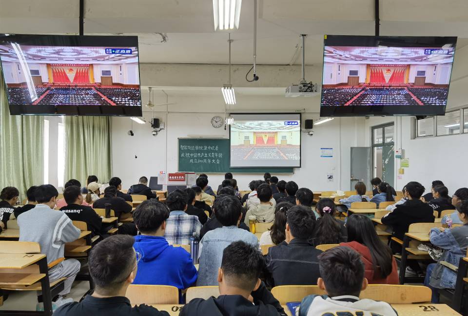 5月10日上午9:50,美高梅娱乐场 在机械楼CS406集中观看庆祝中国共产主义青年团成立100周年大会的直播。美高梅娱乐场 党委书记赵建利,院长李彬,党委副书记王艳敏以及全体辅导员老师参加会议。